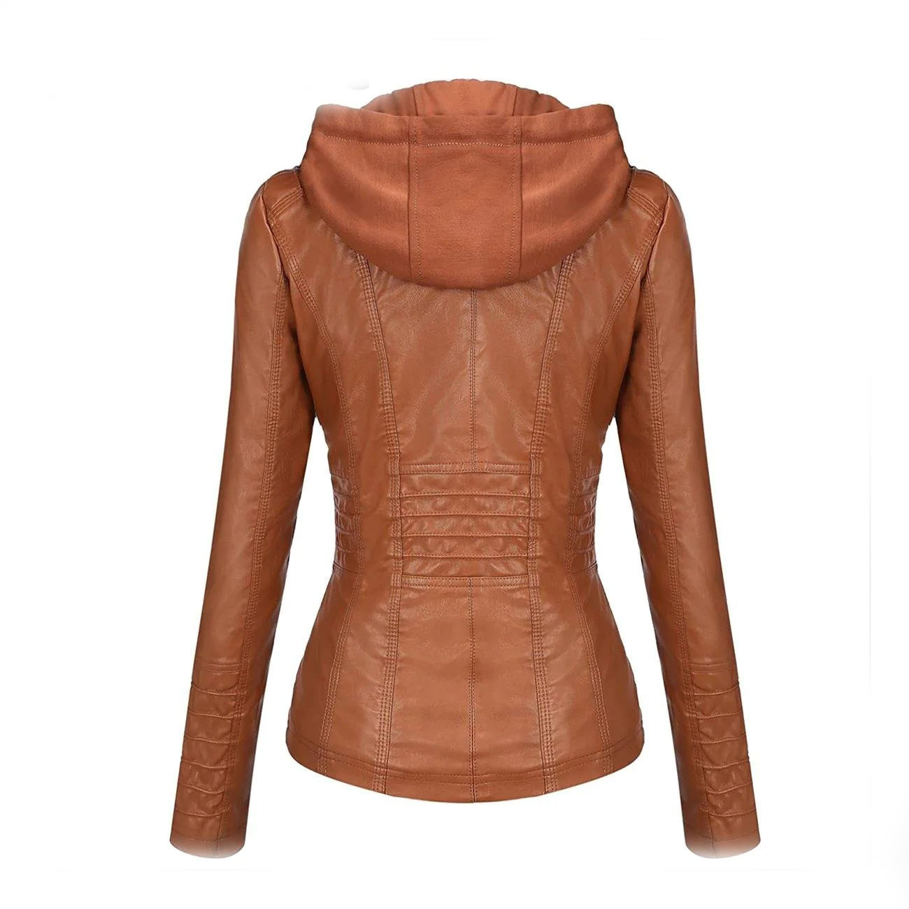 Brown Womens Hooded Faux Leather Fashion Jacket