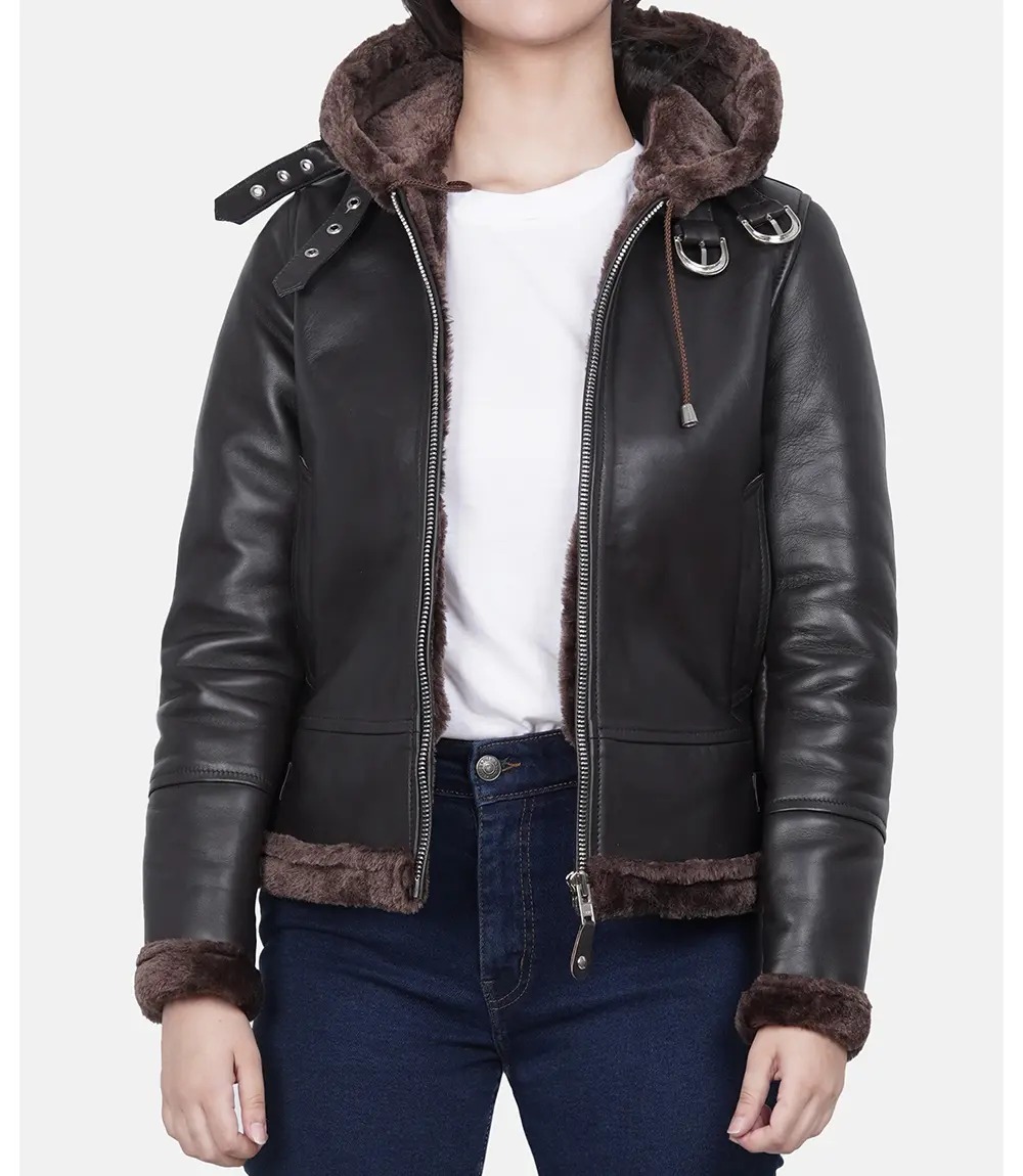 3 reviews for Stylish Women’s Dark Brown Hooded Shearling Leather Jacket