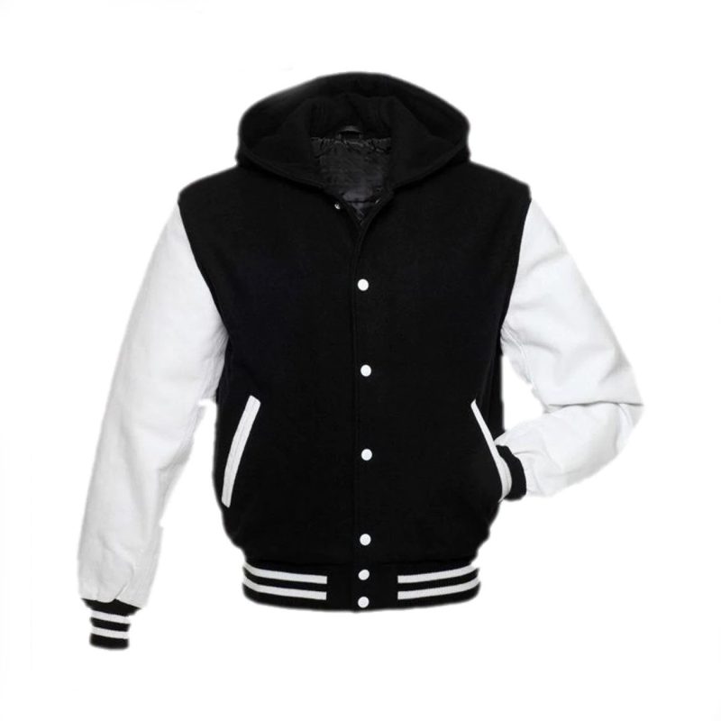 Black Hoodie Varsity Jacket With White Leather Sleeves