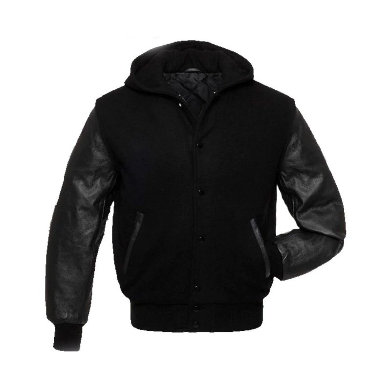 Black Wool Hoodie Varsity Jacket With PU Leather Sleeves