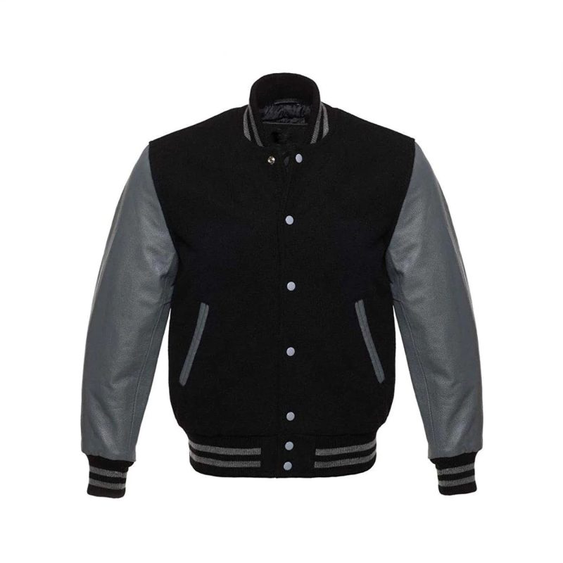 Black Wool With Grey Leather Sleeves Varsity Jacket For Men