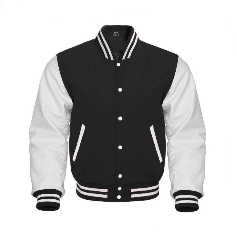 Black Wool Men’s Varsity Jacket With Genuine White Leather Sleeves