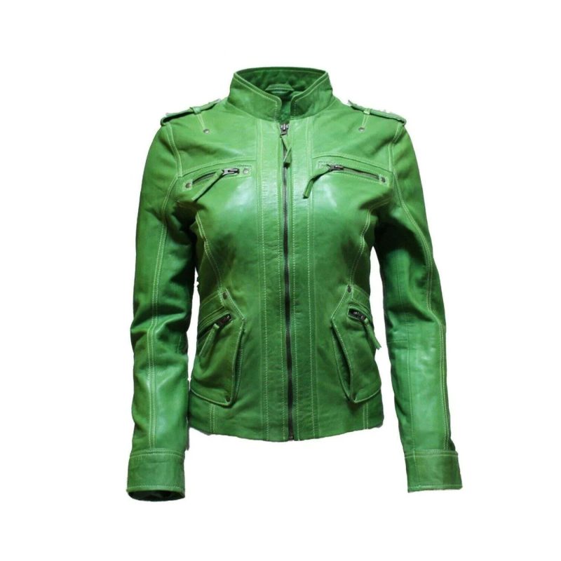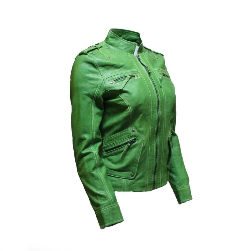 Ladies Classic Apple Green Nappa Leather Multi Pocket Fitted Rock Biker Jacket