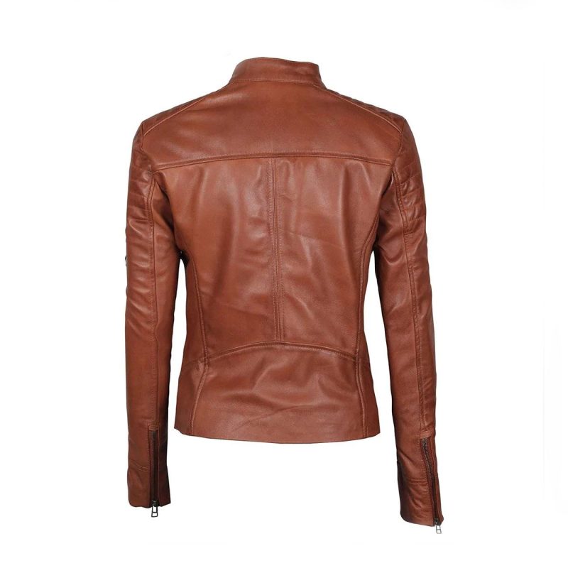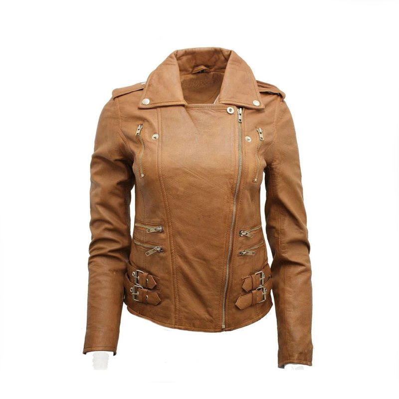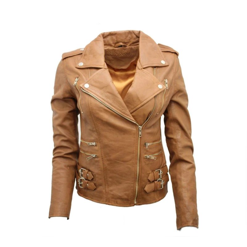 Ladies Tan Real 100% Lamb Nappa Leather Biker Jacket
