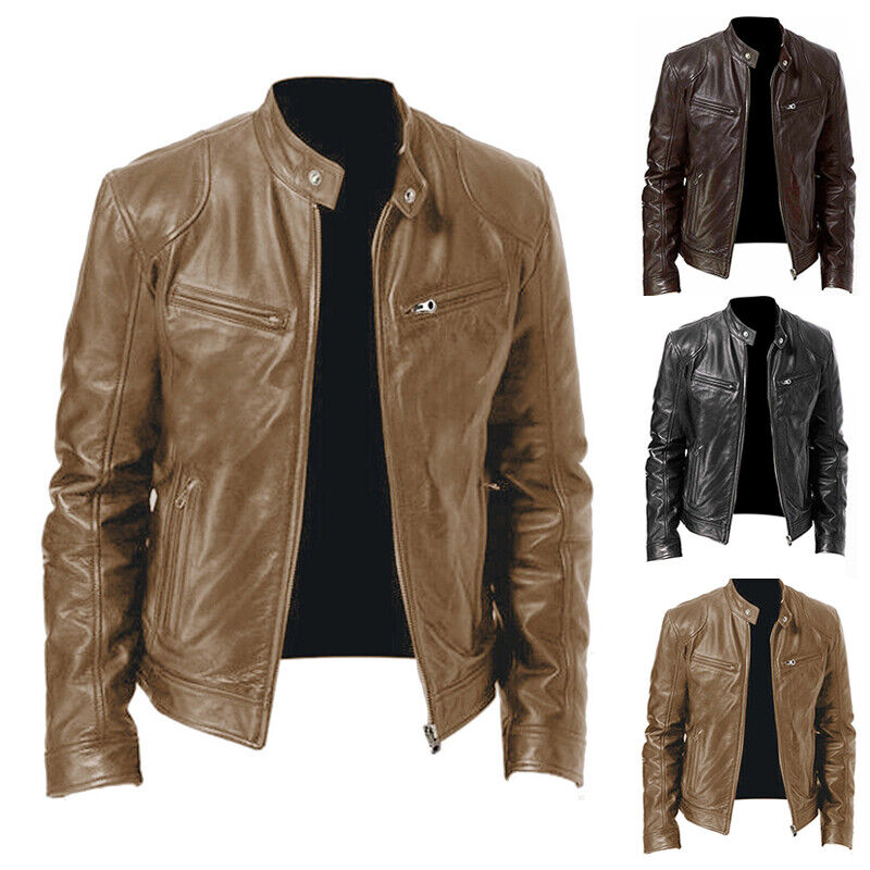 Mens Retro Leather Jacket Motorcycle Stand Collar Biker Coat Zip Up Outwear Top
