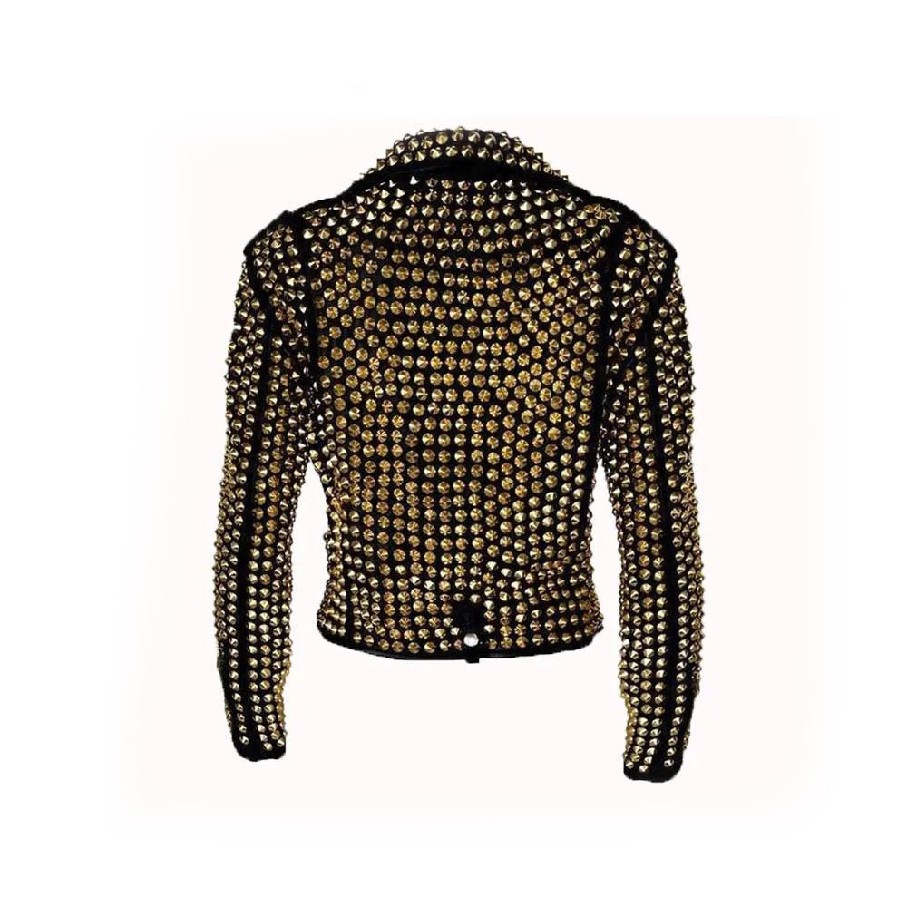 Handmade Women’s Black Fashion Golden Studded Punk Style Leather Jacket