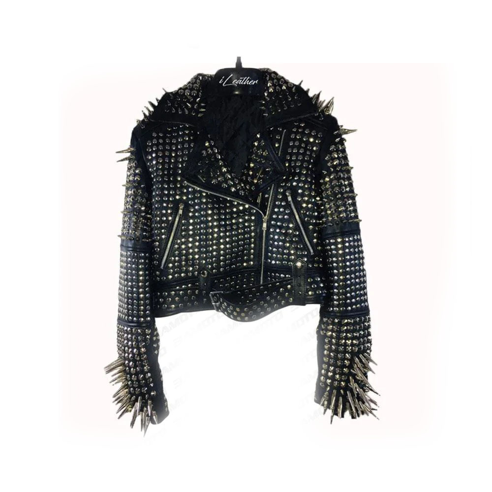 Handmade Women's Black Fashion Golden Studded Punk Style Leather Jacket