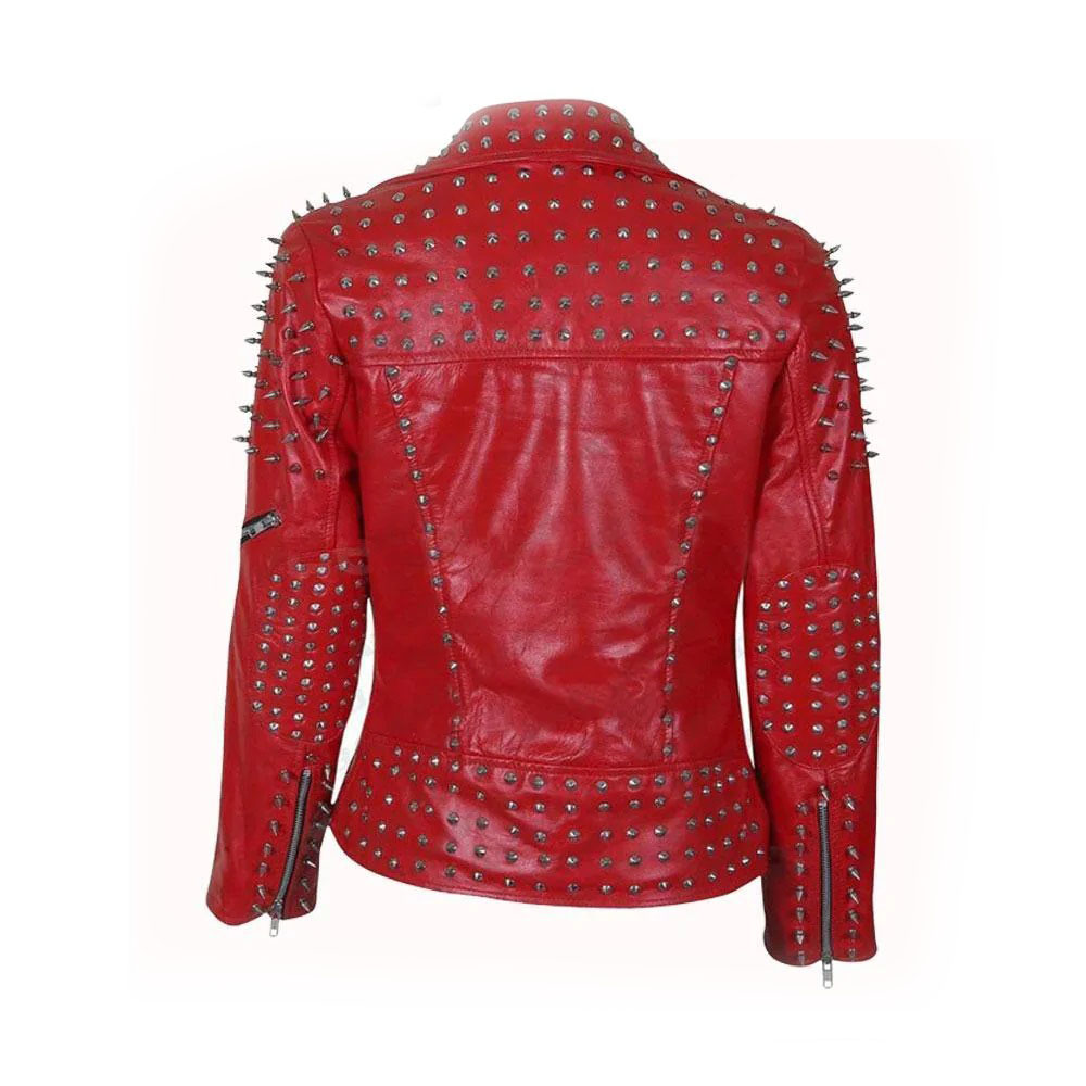 Handmade Womens Red Fashion Studded Punk Style Leather Jacket