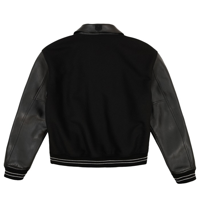 The Men’s Avirex Script Wool Leather Jacket features a front zipper closure with Avirex-branded hardware, offering a secure fit and a stylish, functional design.