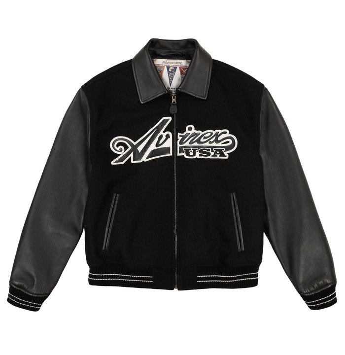 Step up your style game with the Avirex Script Wool Leather Jacket, a perfect blend of luxury, durability, and timeless design. We made the Men’s Avirex Script Wool Leather Jacket with a Merino wool body and leather sleeves. It features an Avirex embroidered script, front zipper, and ribbed cuffs and hem for a snug fit. Our jacket is ideal for bikers, motorcycle enthusiasts, and fashion-forward individuals. Upgrade your wardrobe with a jacket that brings together premium craftsmanship, comfort, and style. Shop now and enjoy the iconic Avirex leather quality jacket.